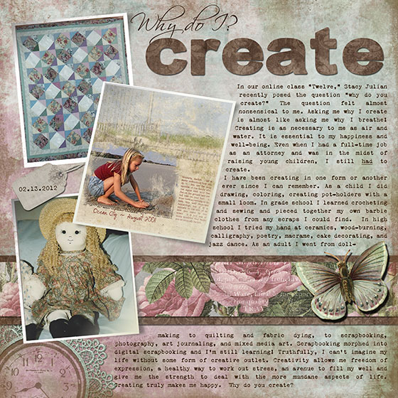 I thought it was an omen when today's prompt was "hobbies." I've had this page in mind since reading Stacy Julian's "20 Questions" for "Twelve" class. Finding photos of my older creations was a challenge - that was all pre-digi! But I did find and scan a couple and here we are!