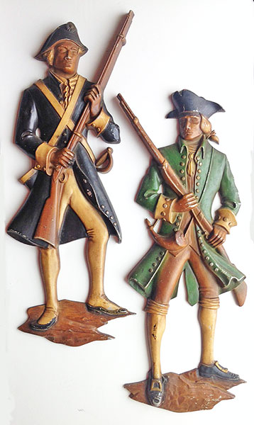 This week's Pick - picked at a firehouse flea market on Sunday morning - a pair of cast aluminum wall plaques depicting soldiers from the Revolutionary War period. The black coat is from the Continental Army, the green coat is a Minuteman. These were created by the Sexton company from Raytown, Missouri circa 1960's and measure about 21" tall each. The Sexton company created cast metal wall decor in a variety of themes (vehicles, military, household items, historical figures, etc.) before going out of business in 2001.